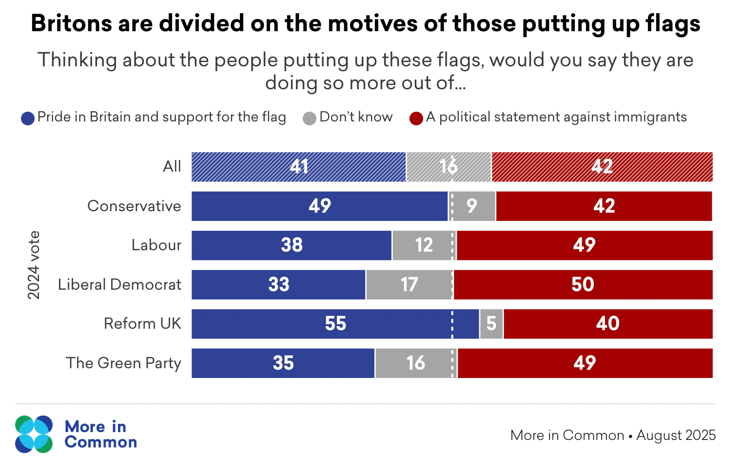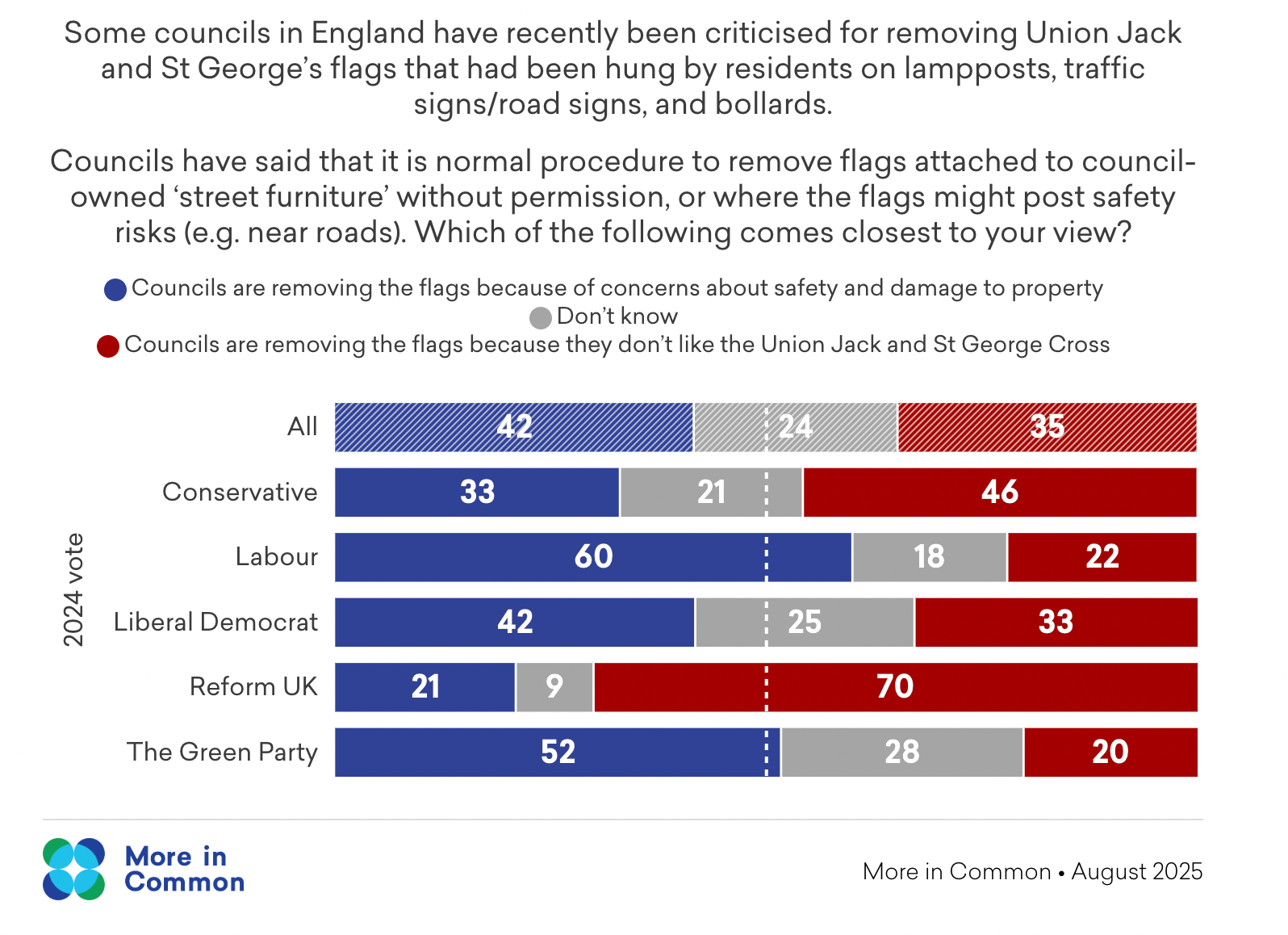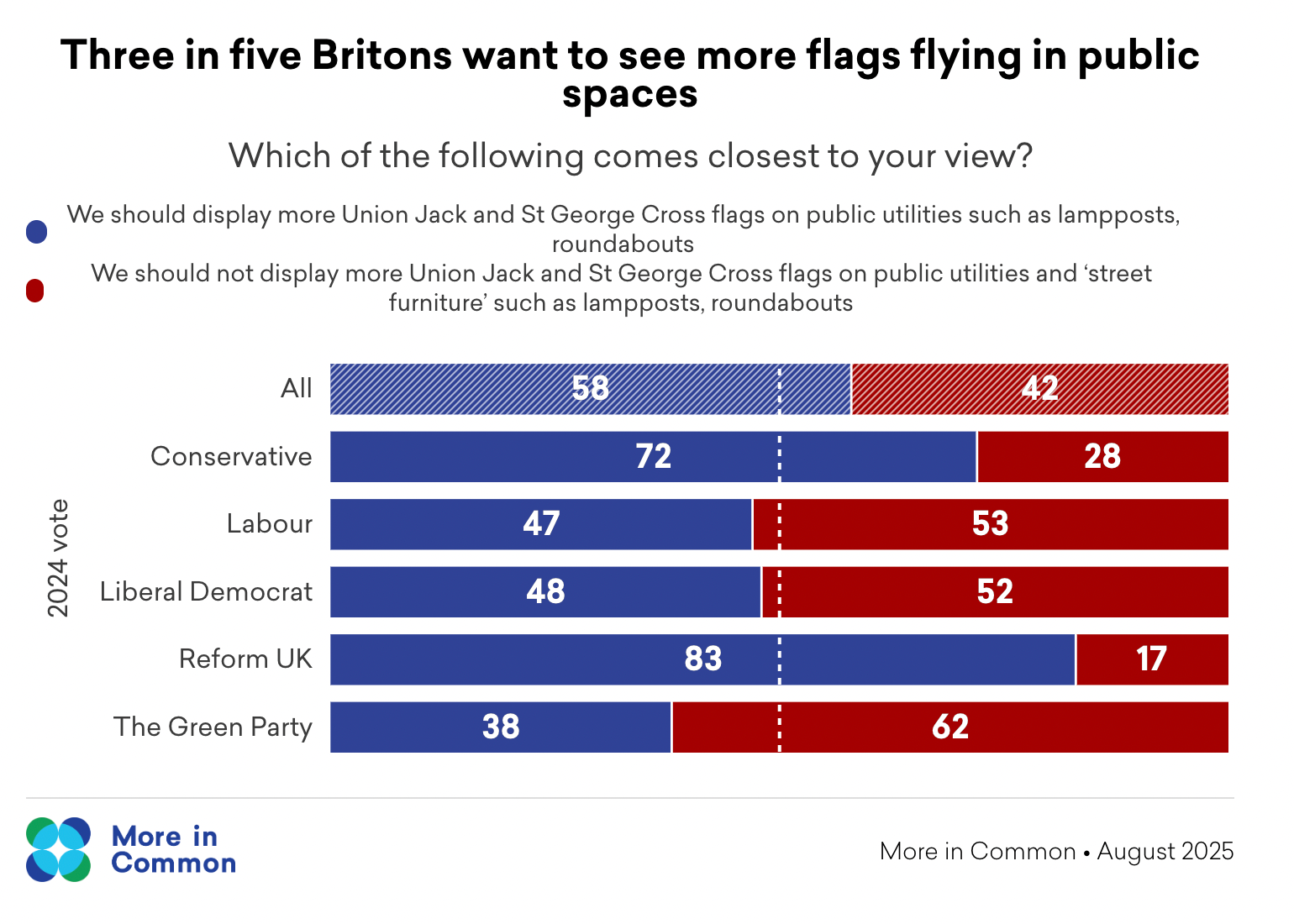 The most up to date (and trustworthy) figures on the attitudes of British people towards the flag debate were produced by More in Common in August 2025 in response to current events. These are the headlines: