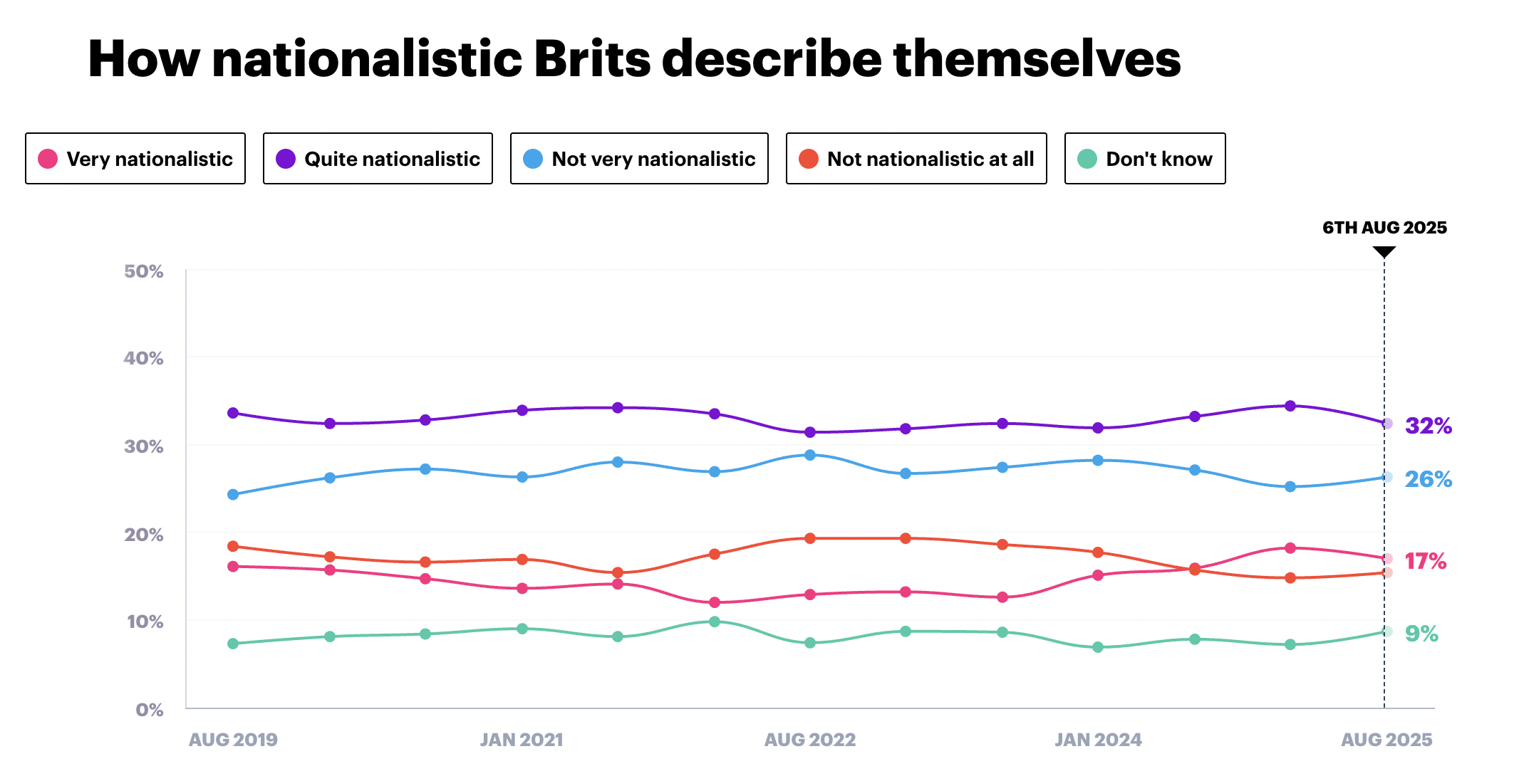 At least the good news is that Britons do not currently feel more nationalistic than they have over the last 20 years. In fact, in Britain we are slightly less nationalistic (by 1%) than we were in 2019.