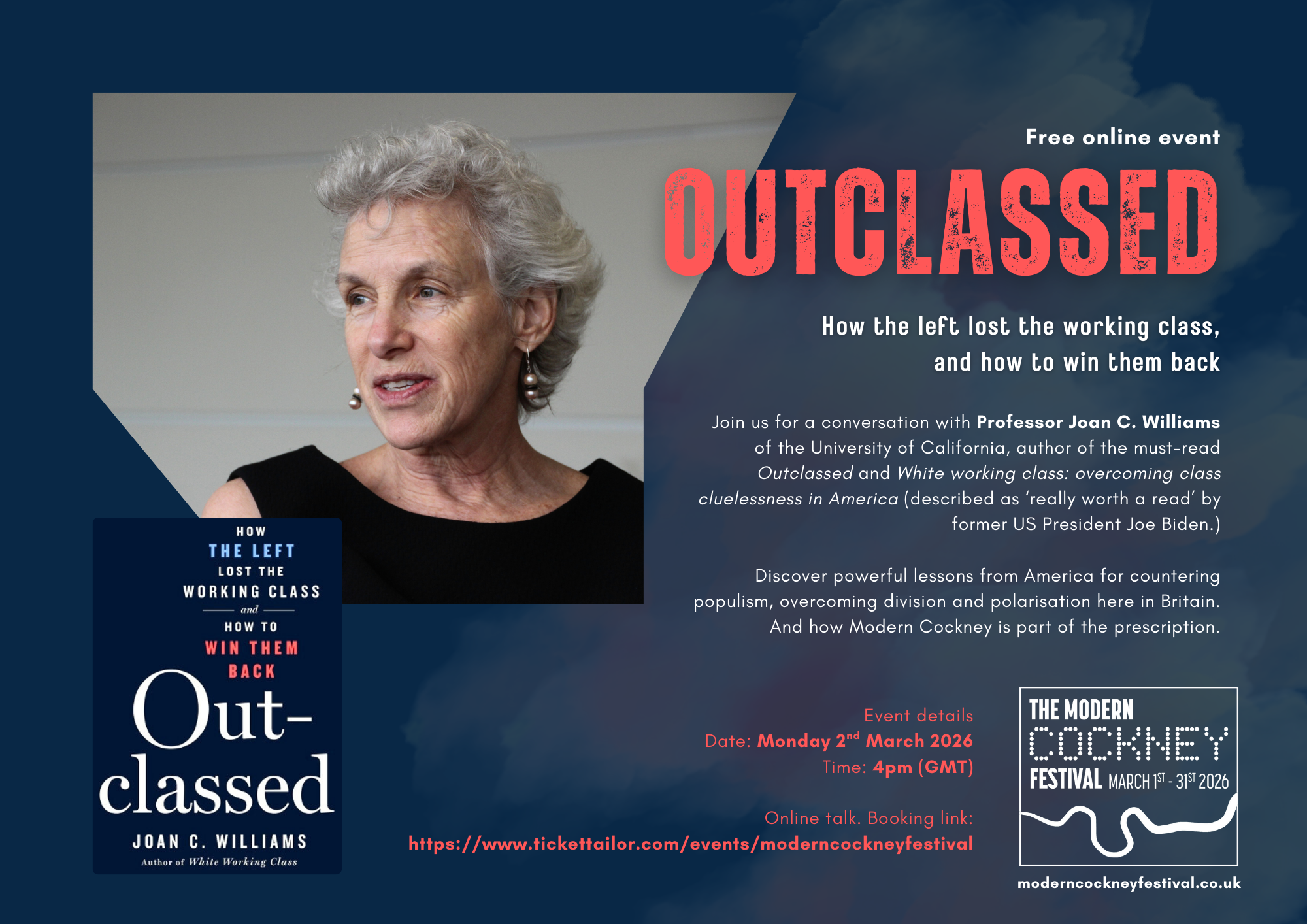 Lesson four: we discovered the ‘Brahmin Left’. A label created by French political economist Thomas Piketty, that informs the must-read ‘Outclassed: how the left lost the working-class, and how to win them back’ written by Professor Joan C. Williams of the University of California, who’s doing the first talk of this year’s Modern Cockney Festival.