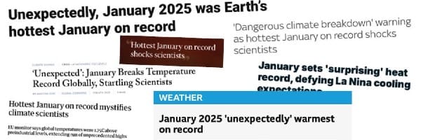 Have you noticed how quickly everything seems to be happening? This year is moving at lightning speed. Among the panoply of developments so far – from the fast track to fascism to looming World War III – January 2025 turned out to be the hottest January on record. This news was of course a momentary blip on the radar of the psychotic media agenda.