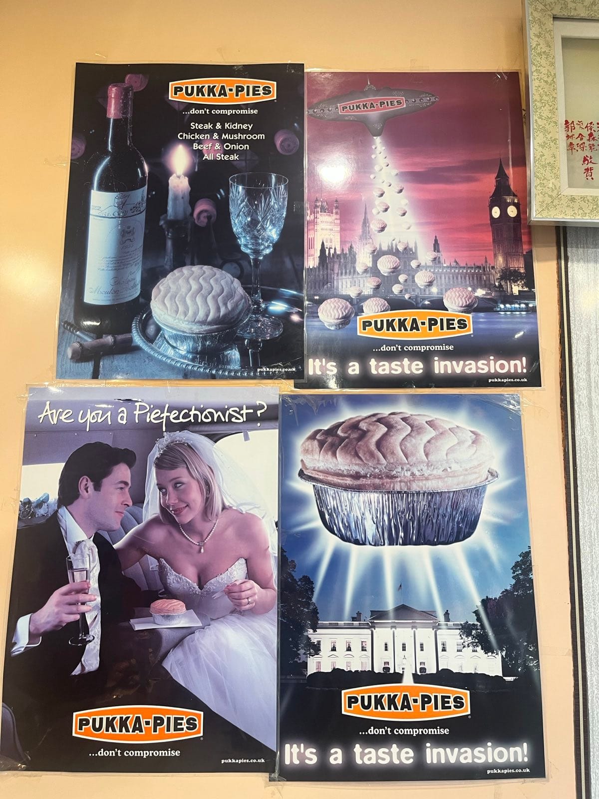 On the opposite wall is a series of posters for a brand of pie. Each one is deliberately silly, and all are faded. They must have been up for over a decade.