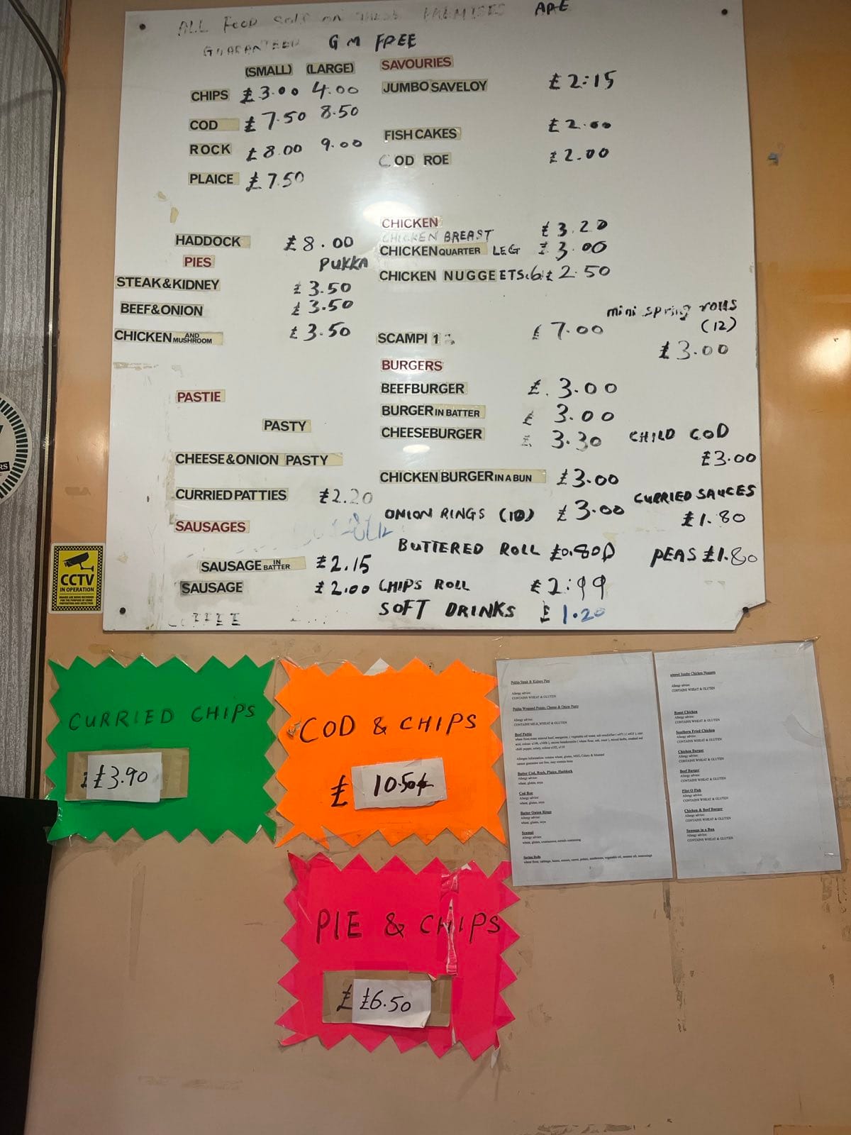 The lights are florescent, the decor cheap and cheerful. There’s a tall fridge of soft drinks with major and minor brands. There are, for some reason, two clocks, both wrong. It smells of hot fat, batter and vinegar, with a hint of cleaning fluid.