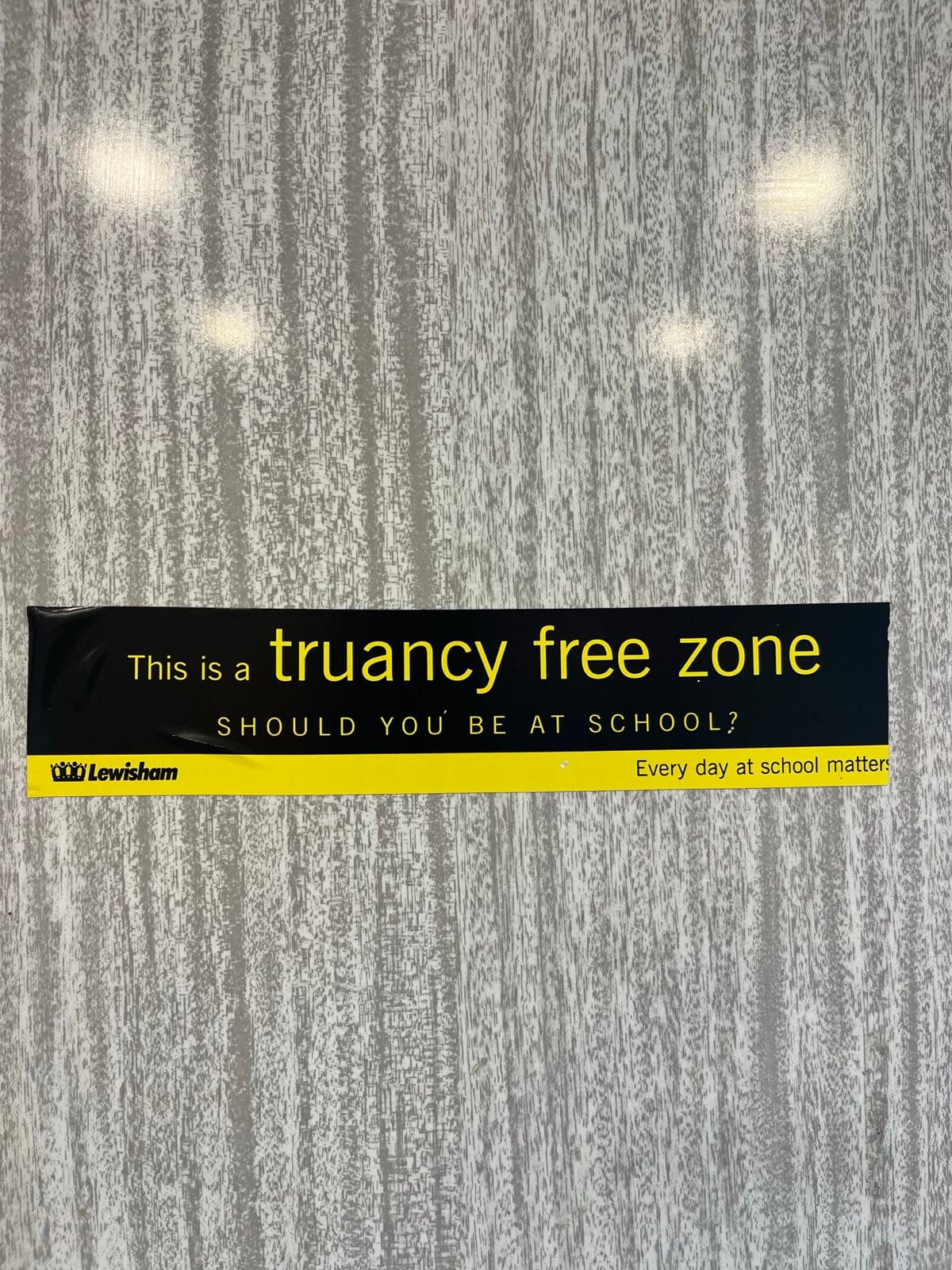 Next to them is a small sticker from the local council. You have to lean in quite close to see it reads “should you be at school?”.